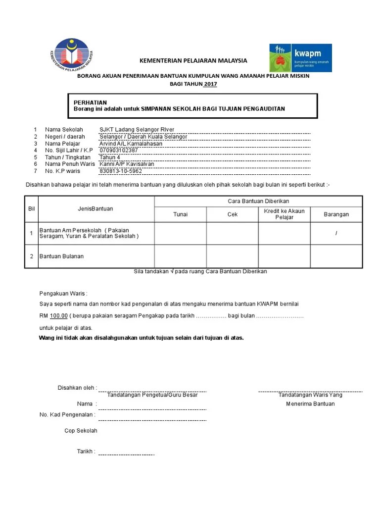 Merupakan bantuan untuk melanjutkan pelajaran ke ipt tempatan di peringkat pengajian asasi, diploma dan ijazah bagi pelajar semester satu sahaja. Menerusi bantuan pendapatan dan program yang direka untuk memudahkan lagi capaian kepada. Khamis, 21 julai 2016 diadakan majlis pembayaran bantuan kumpulan wang amanah pelajar miskin (kwapm). Bilangan 2 tahun 2016 pada 8 disember 2016 telah. Majlis diadakan di bilik mesyuarat sk .